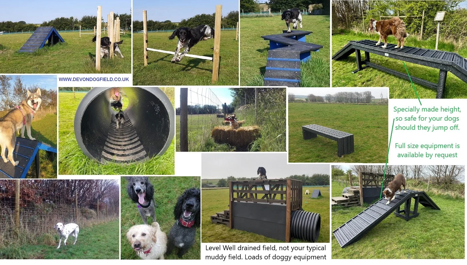 The Devon dog field is totally secure with 1.9m tall fence designed to keep all dogs in. No it's not an empty field, it's more like a Park, grass is kept short and we have an area which allows dogs to have a good run and play, plus we have lots of dog adventure equipment for them to try. Please scroll through our pictures to view our great range of canine equipment.